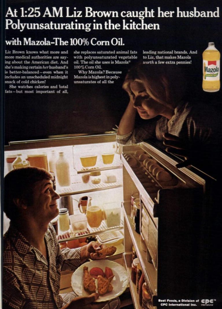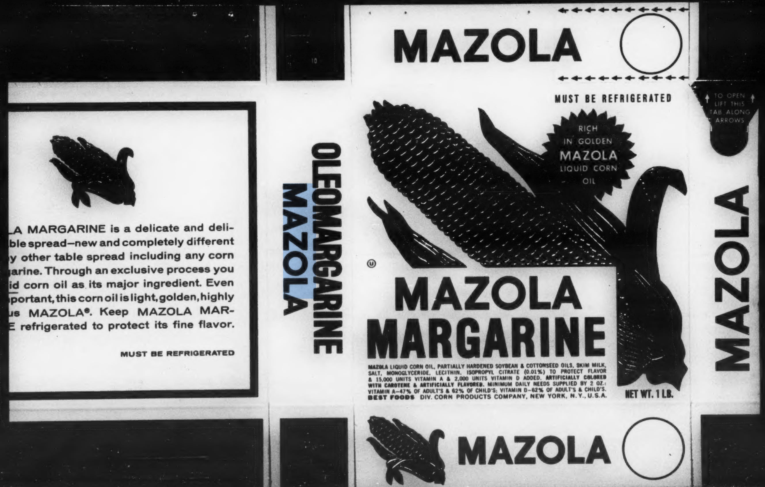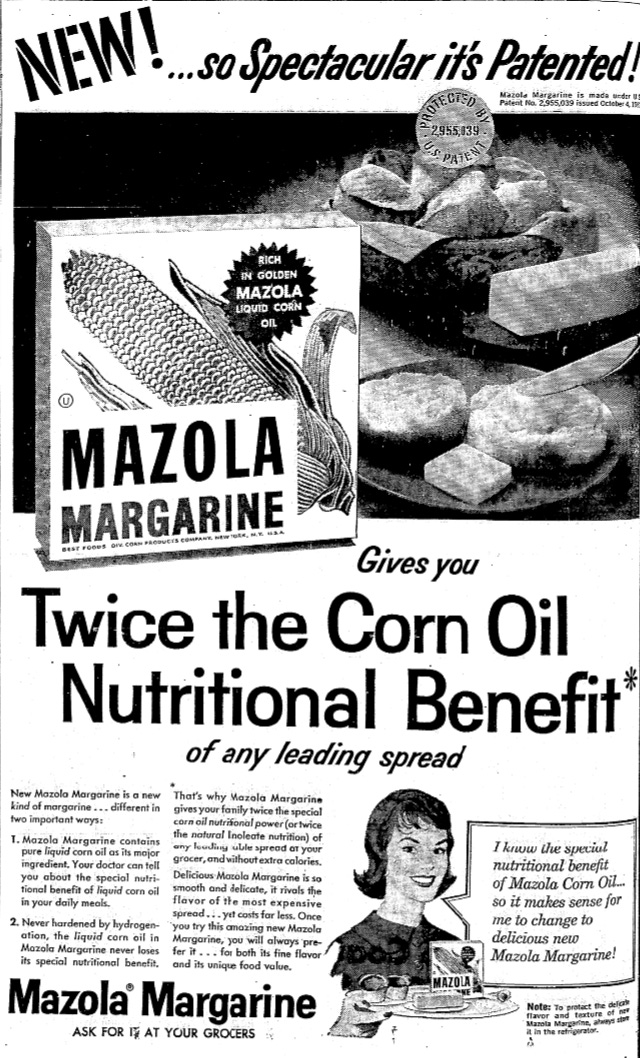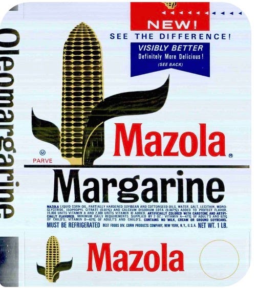 Either they thought the Mazola Margarine had better sensory characteristics and was better for blinding the subjects, Mazola was simply better at supplying the volume they needed, or they did it because they valued their relationship with Mazola, who was also providing the liquid corn oil that constituted the top oil ingredient of the seed oil diet.