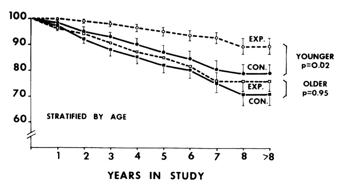 The beginnings of divergence after the 8-year mark represents a three-month period during which everyone was on the control diet while undergoing final examinations. If this is a real divergence, it is likely a result of 6-8 years of seed oil consumption increasing tissue PUFA content and thereby increasing the vitamin E requirement, while the vitamin E intake was suddenly dropped to the deficient level of the control diet.