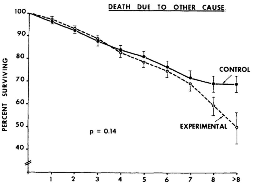 The reason this doesn’t show up in the total survival graph is because the seed oil group’s advantage for atherosclerotic death is increasing at the same time. Thus, one for one, every person that the seed oil diet saved from an atherosclerotic death was balanced by someone who died of something else.
