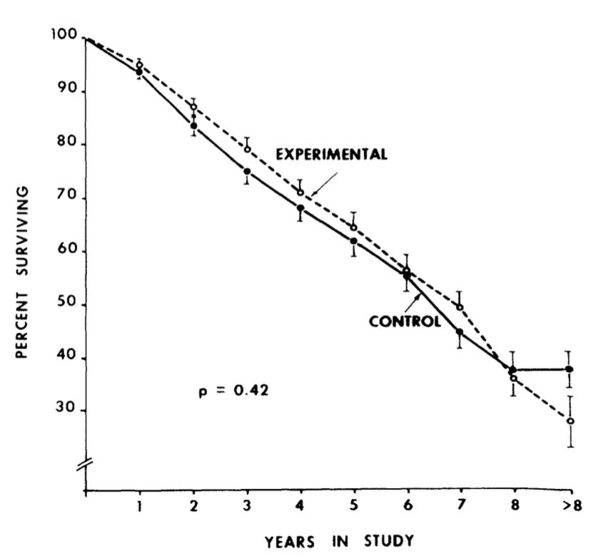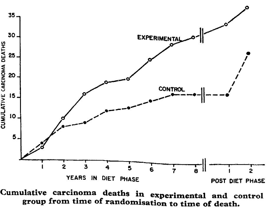 The difference didn’t even start to emerge until year two and really took off in years 5-8. It just barely missed statistical significance at p=0.06. This means the chance of observing a difference this large or larger if seed oils don’t really raise the risk of cancer is 6%.