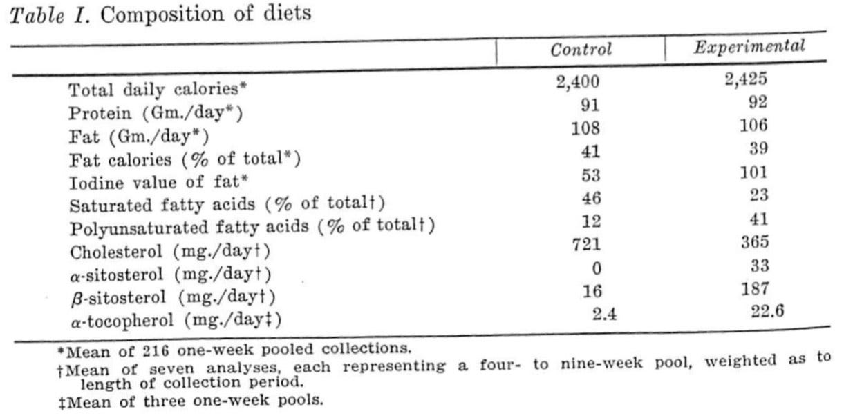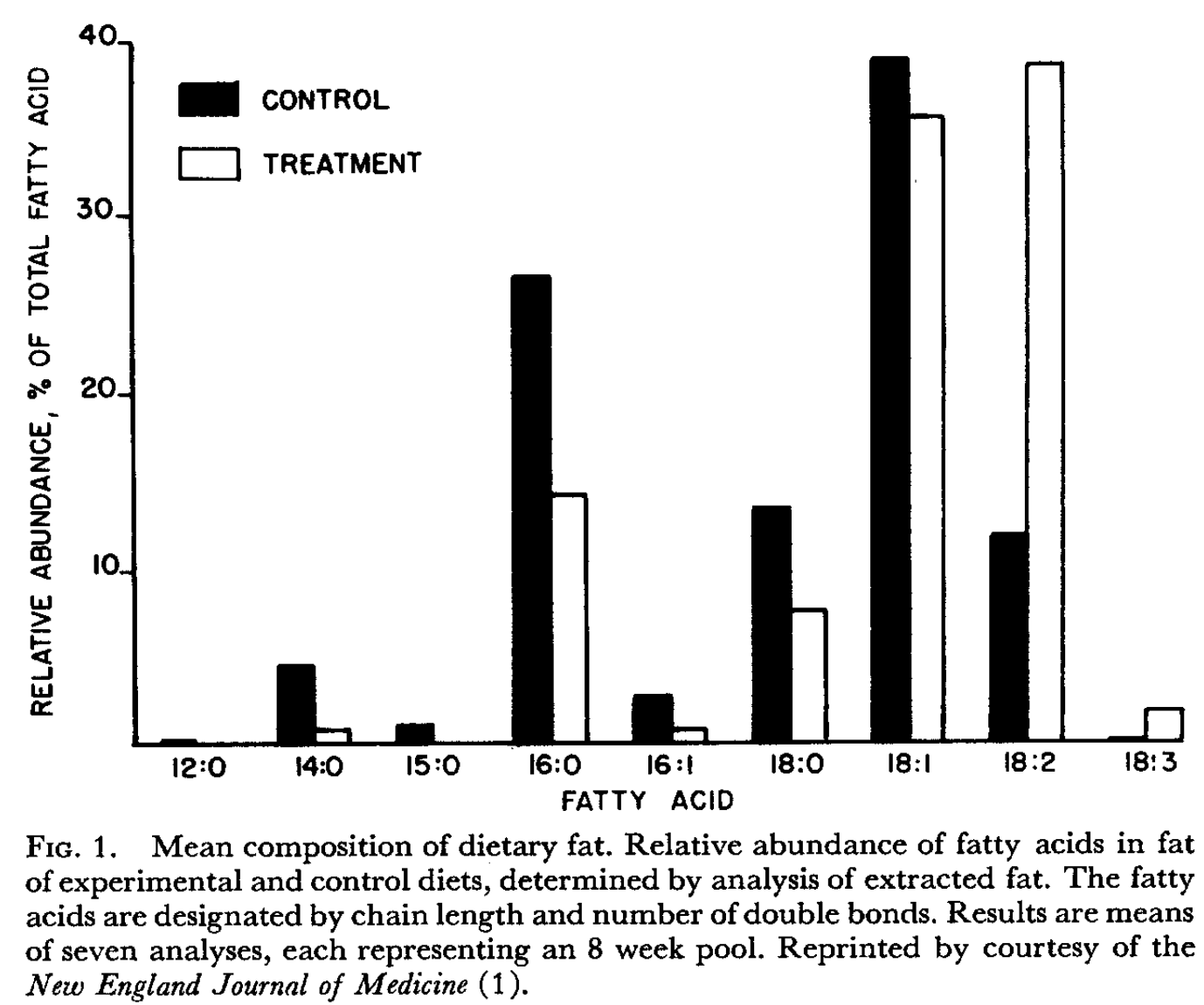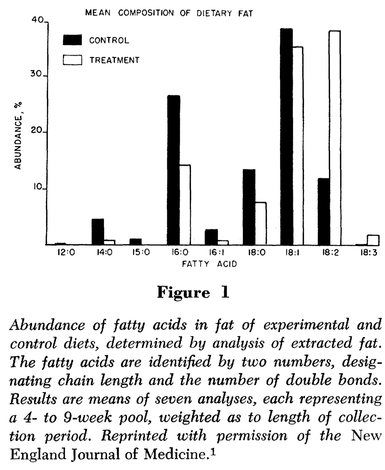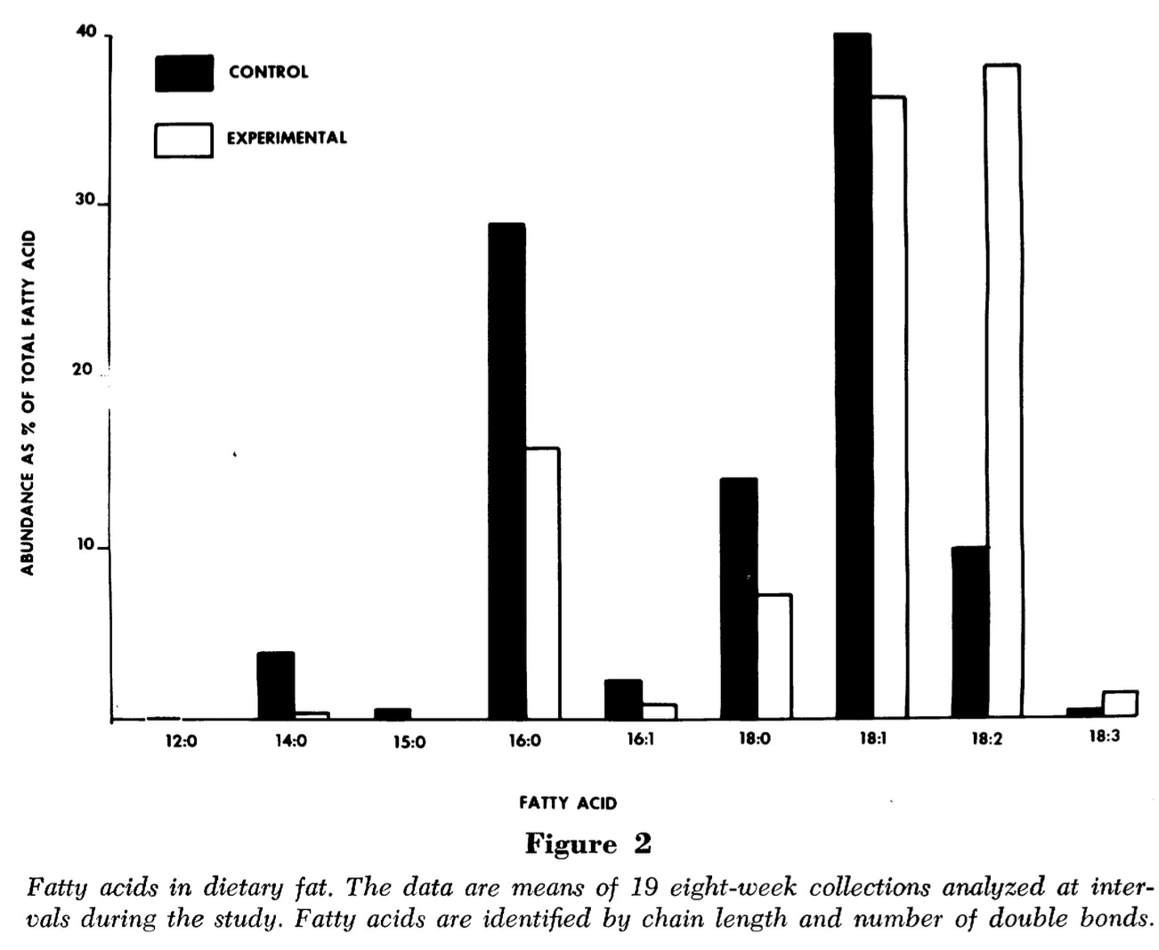 According to the authors, what they were testing was “a replacement of the saturated animal fats and hydrogenated shortenings of the conventional diet by equal quantities of unsaturated fat in the form of vegetable oils in the experimental diet.”
