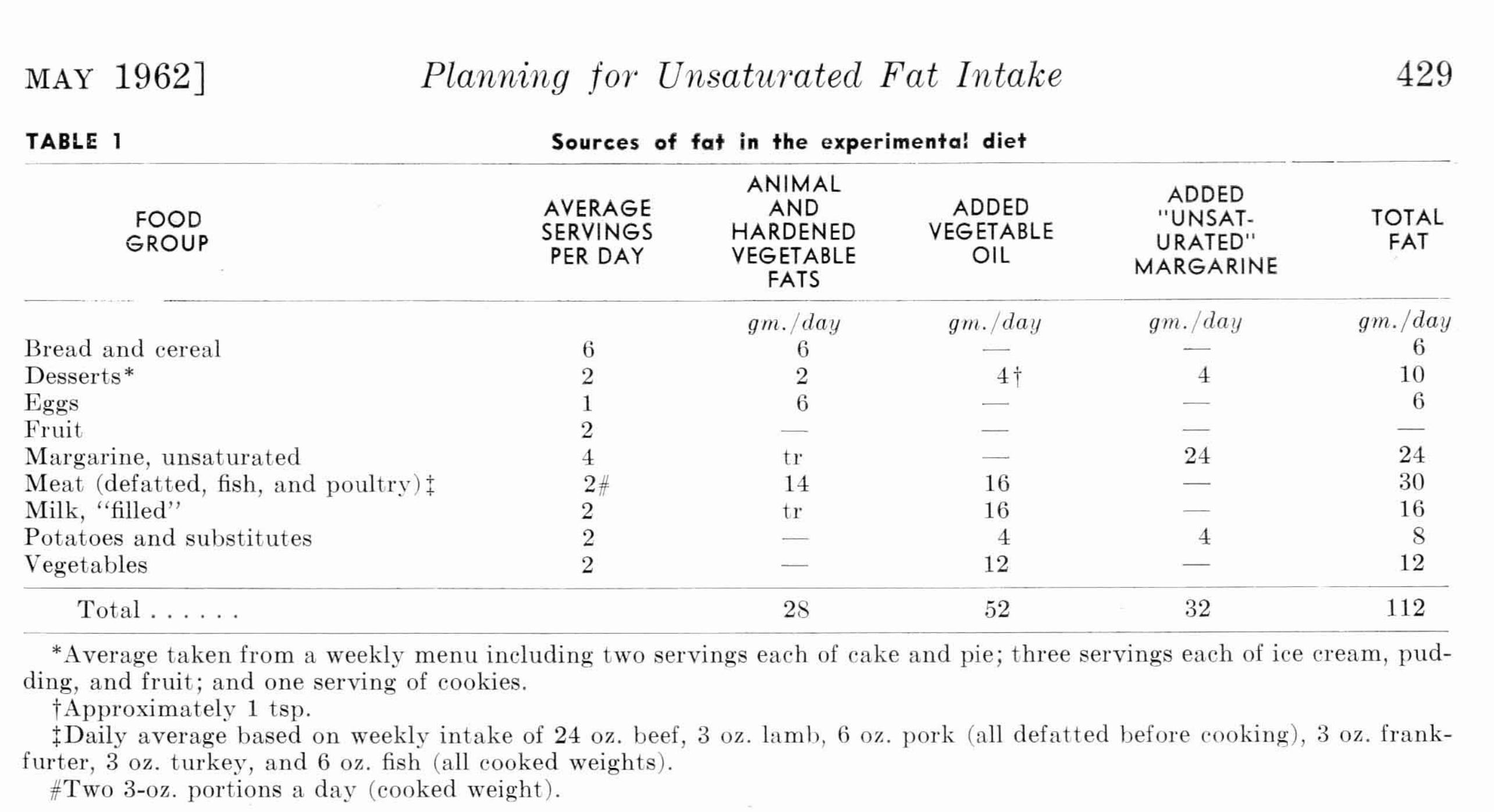 As they detailed in a 1962 paper, approximately 32 grams of fat per day in the seed oil diet — 28.5% of the total fat — came from an “unsaturated margarine.” 75% of this was used as a table spread, while the rest was used to bake deserts or cook potatoes.