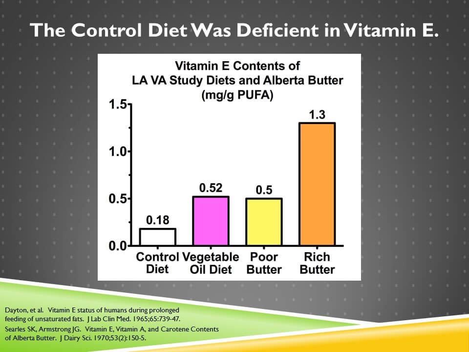 The control diet had barely more than a third of what is found in run-of-the-mill commercial butter and far less than what is found in grass-fed butter, while the seed oil diet was just below the optimal ratio of 0.6 milligrams alpha-tocopherol per gram of PUFA.